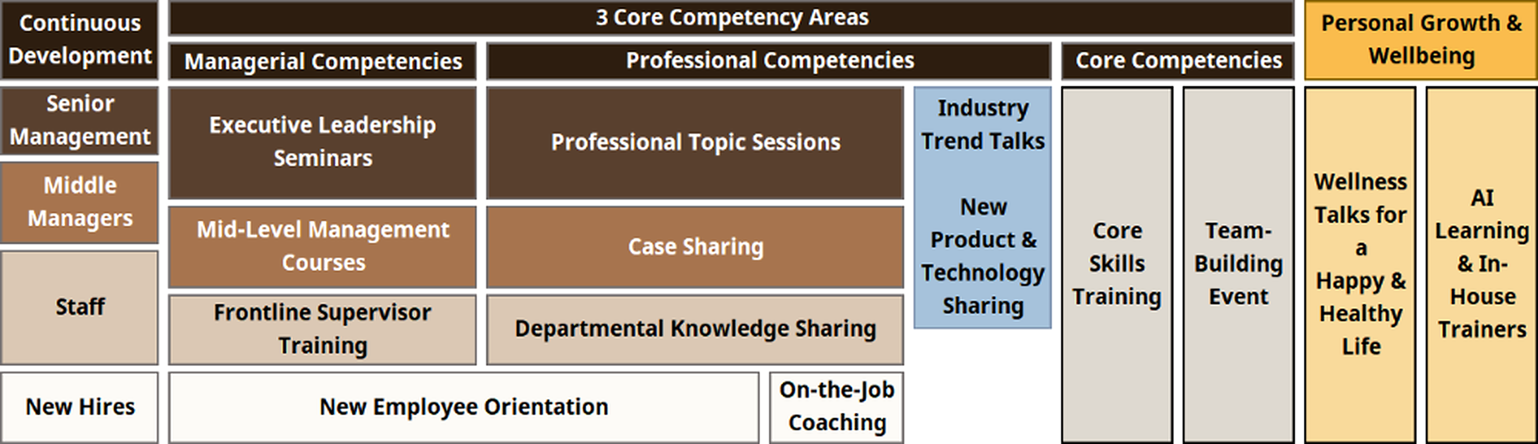 - 基層員工:參與「基層幹部管理課程 (基層主管培訓)」,發展基礎管理與溝通能力。